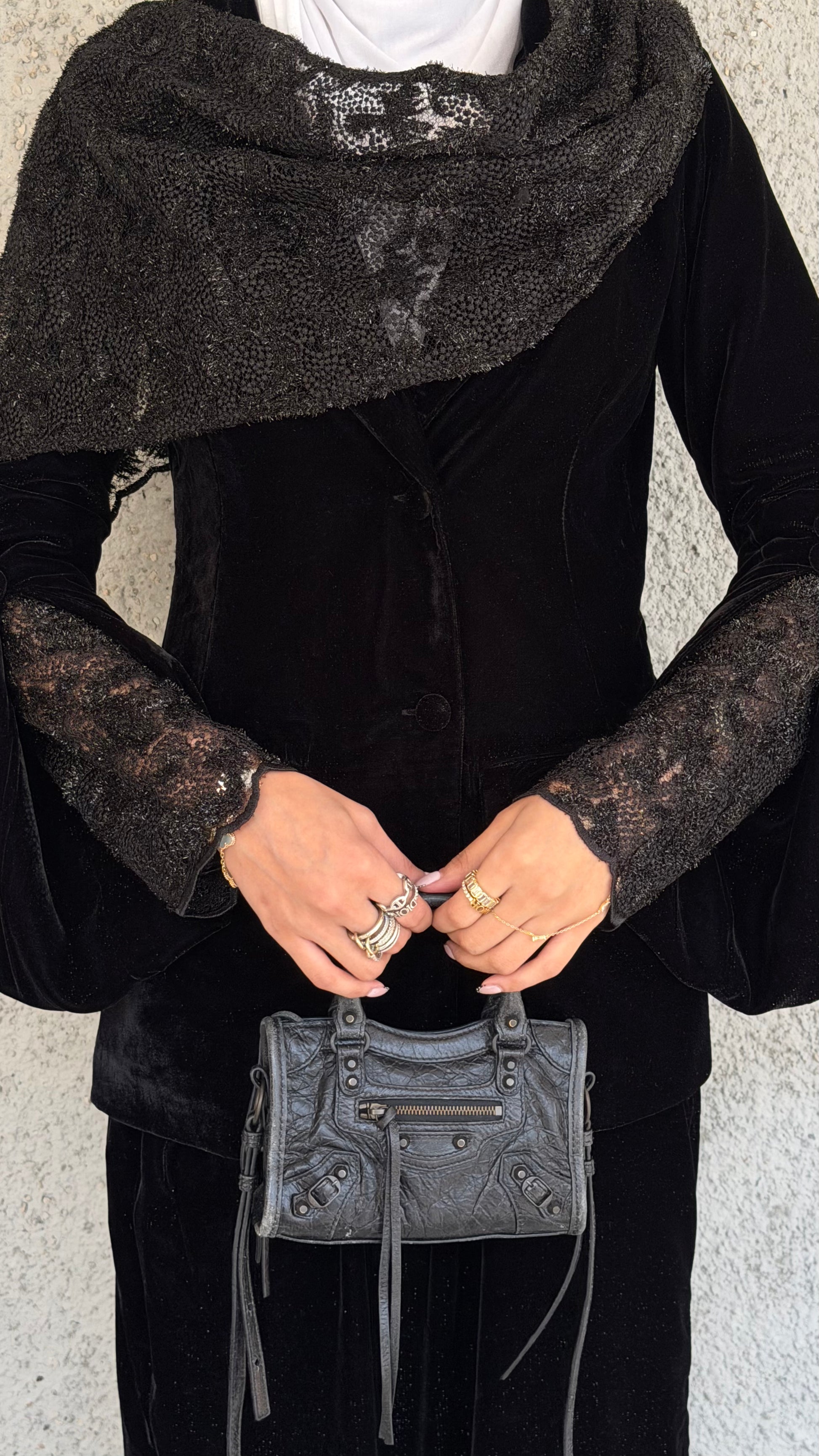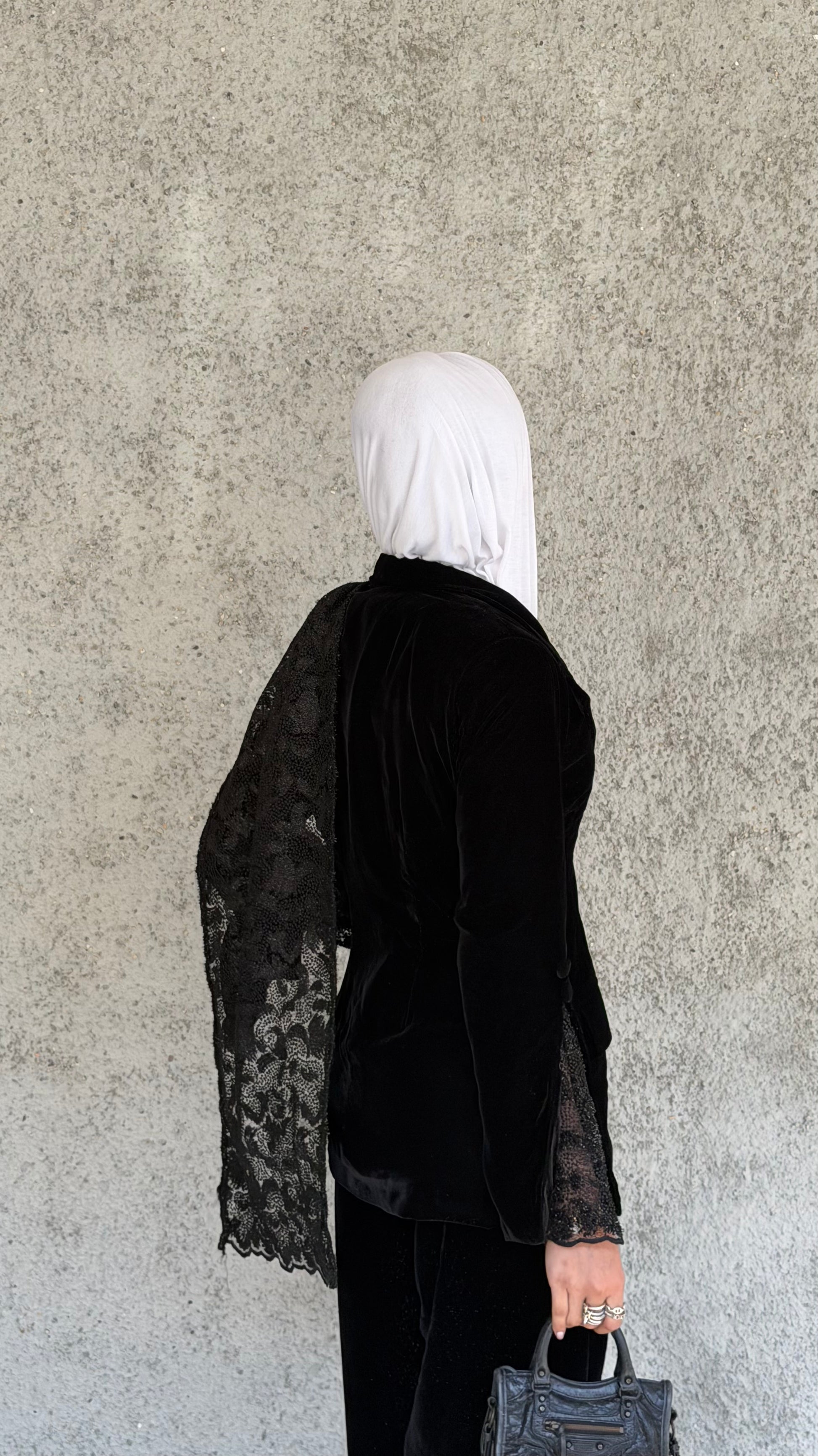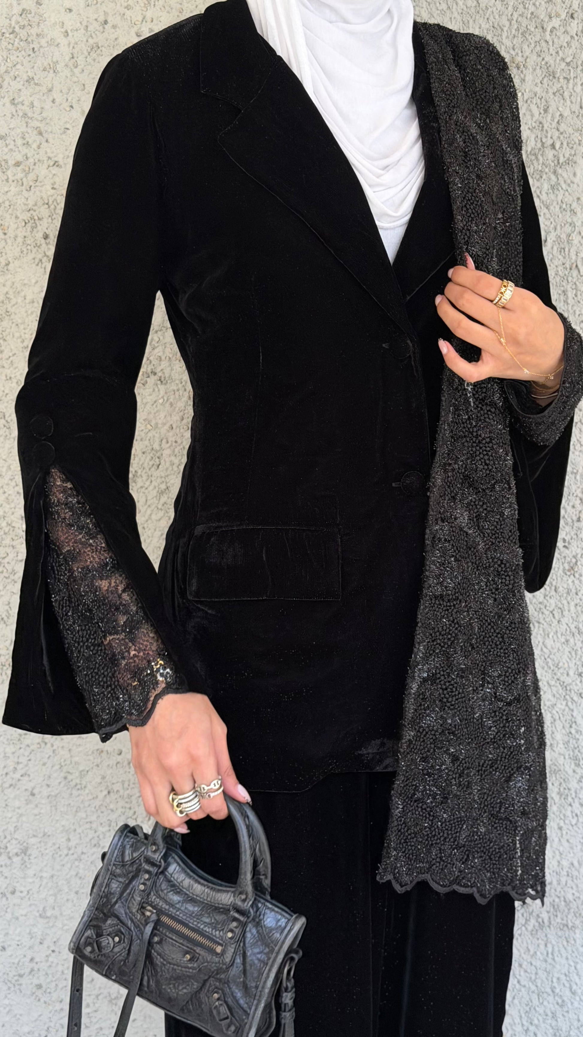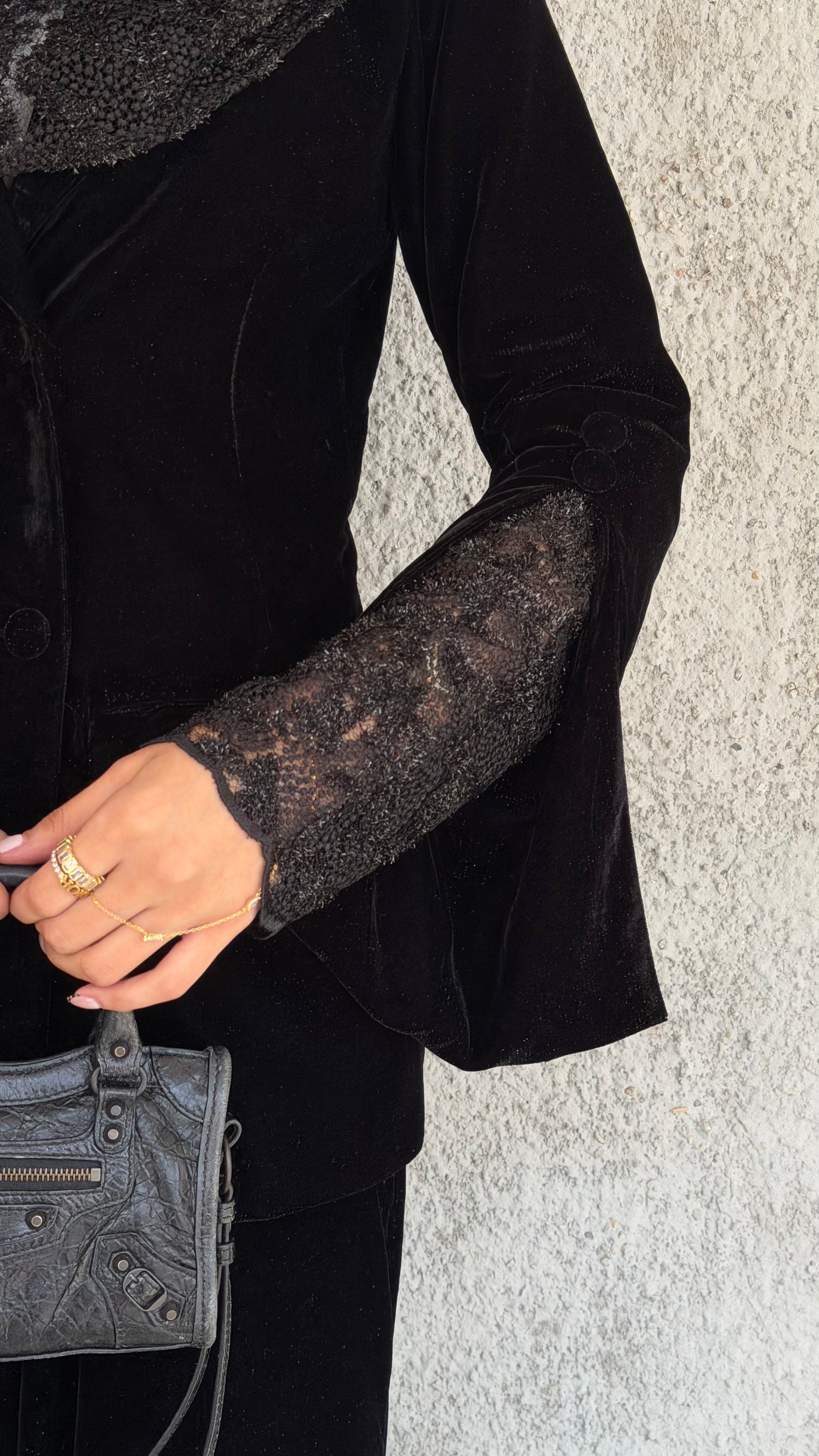 Elevate your wardrobe with this luxurious velvet and lace set, featuring a chic jacket with lace sleeves and a matching lace scarf paired with elegant velvet pants. Crafted from glittery black velvet and delicate lace, it offers a perfect blend of comfort, sophistication, and timeless style.