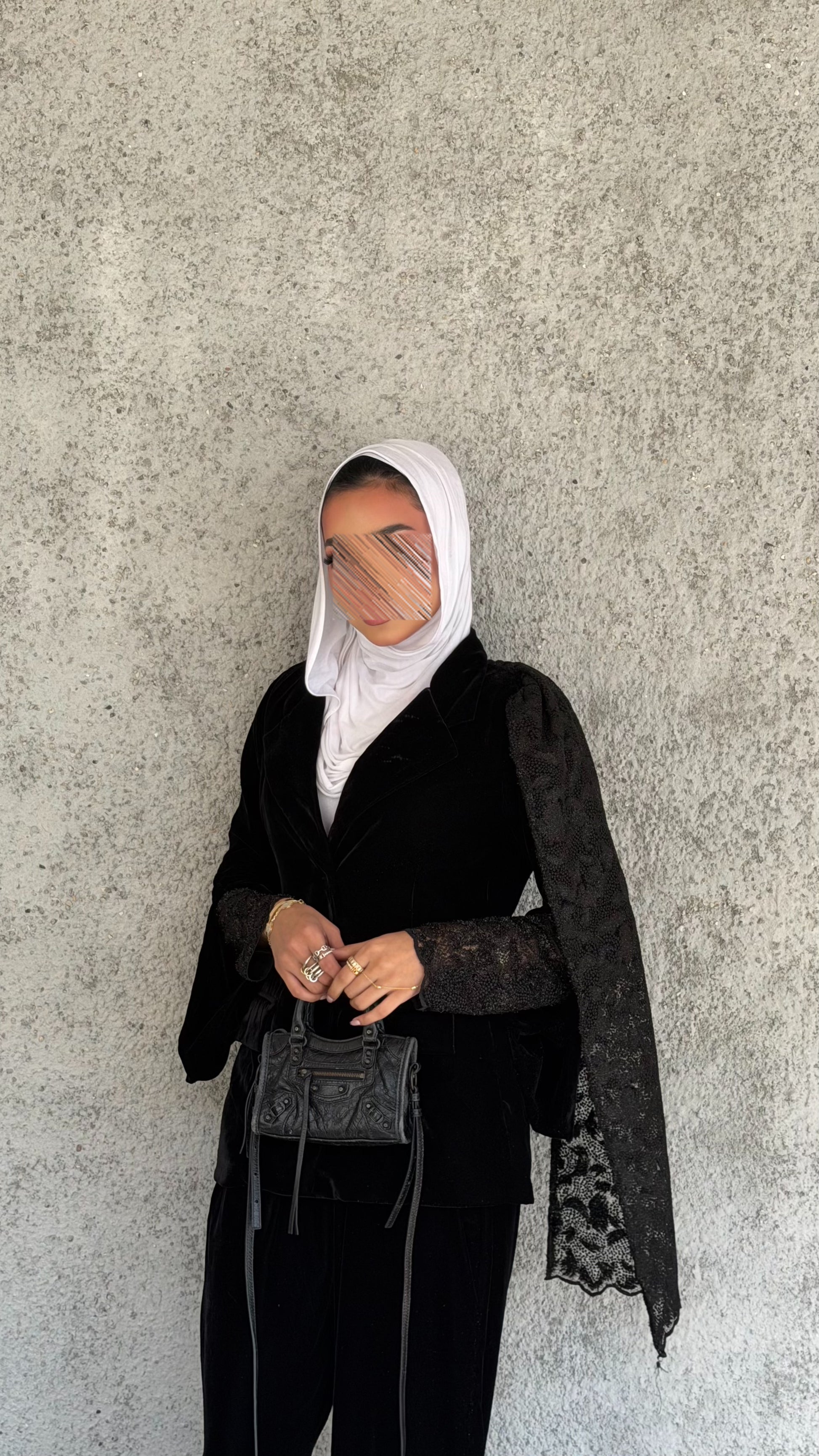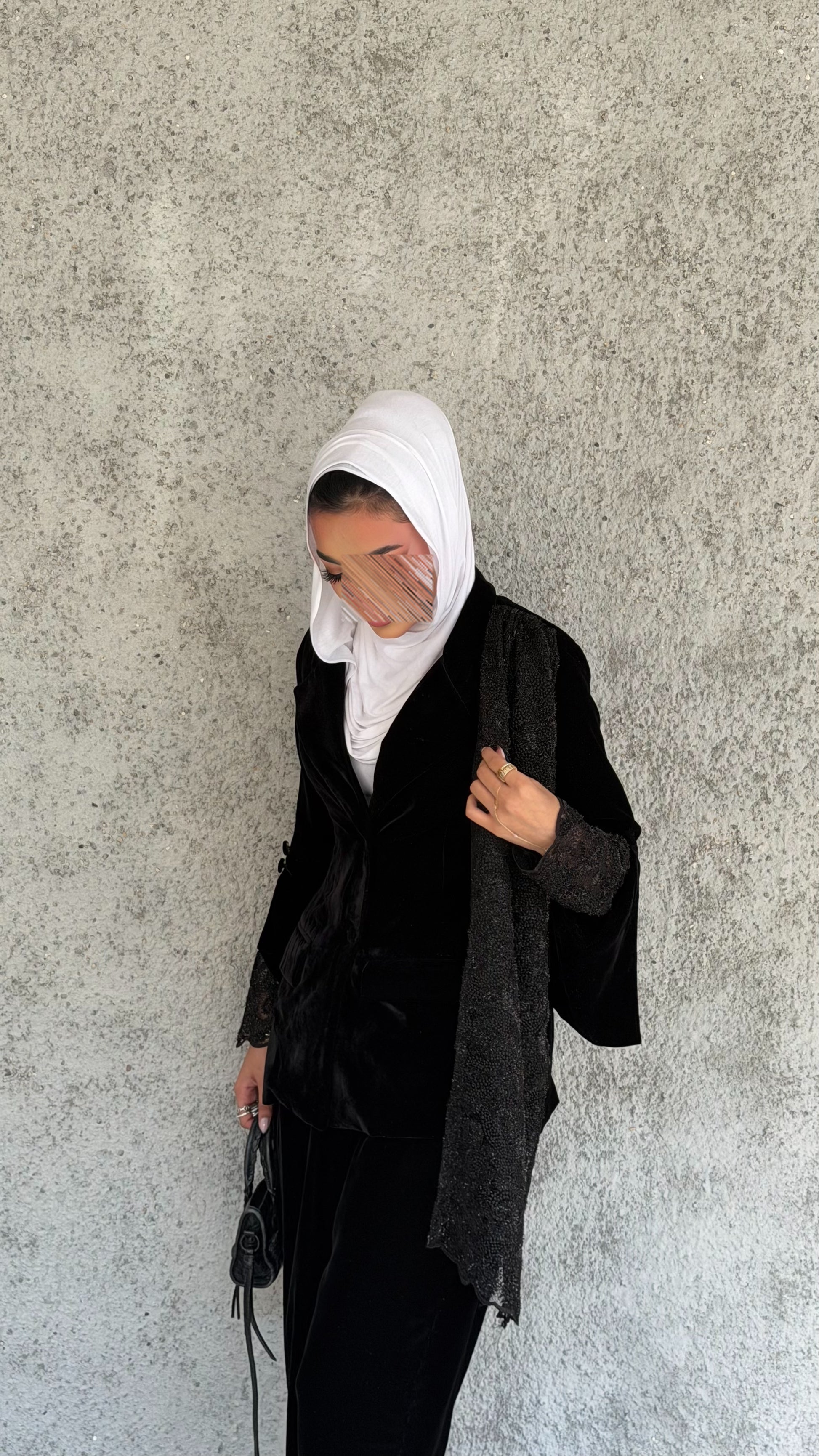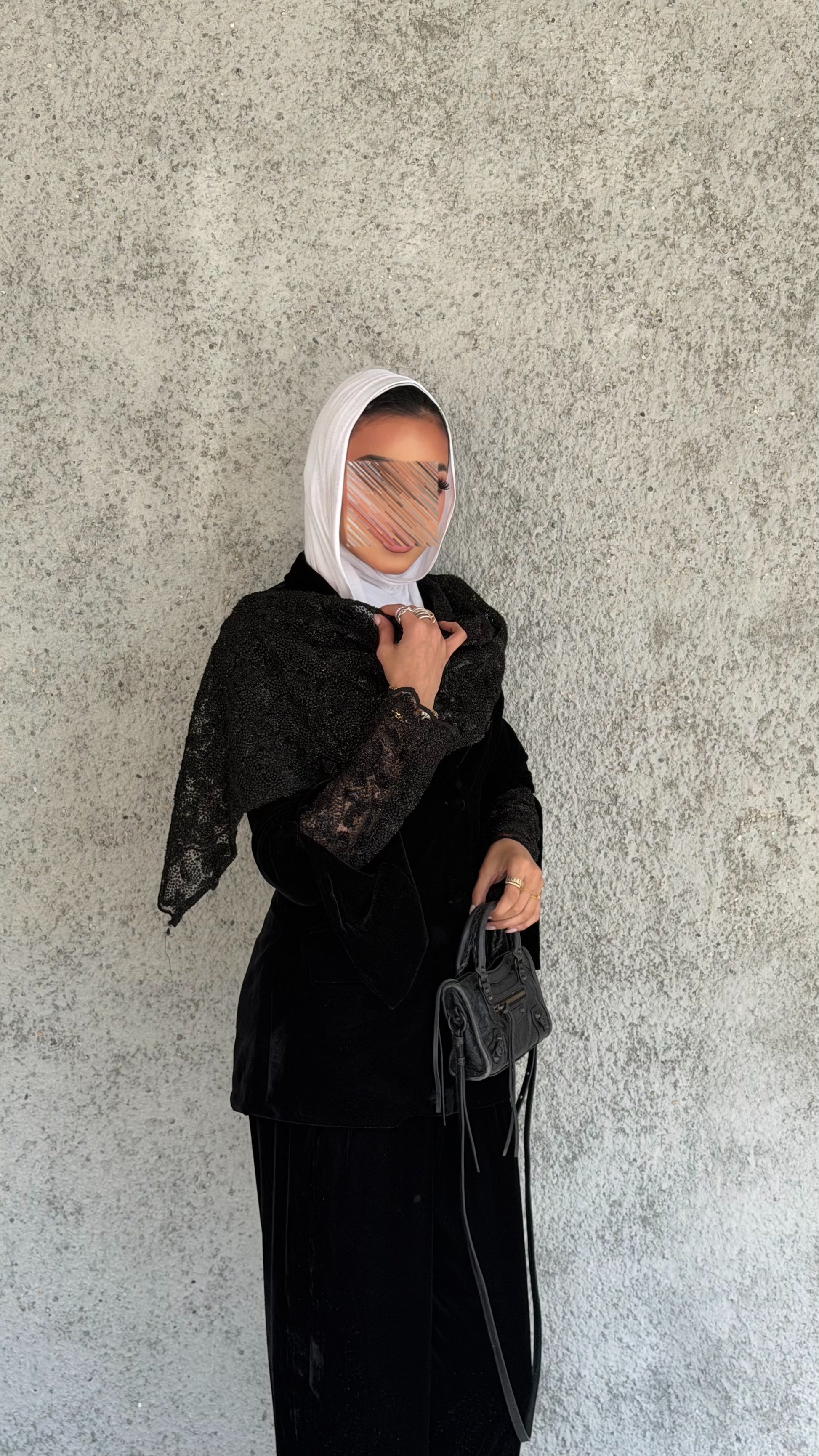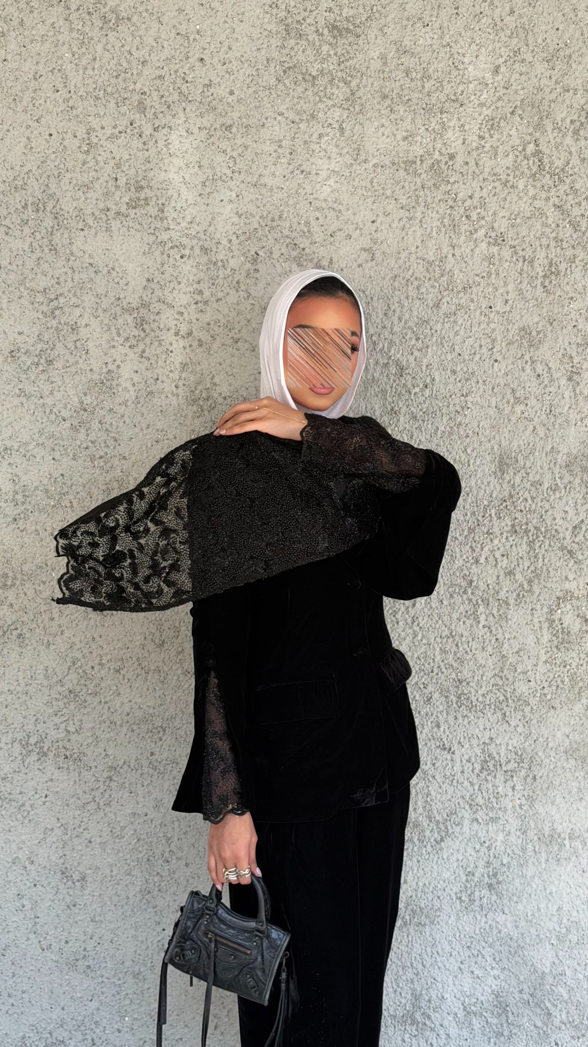 Elevate your wardrobe with this luxurious velvet and lace set, featuring a chic jacket with lace sleeves and a matching lace scarf paired with elegant velvet pants. Crafted from glittery black velvet and delicate lace, it offers a perfect blend of comfort, sophistication, and timeless style.