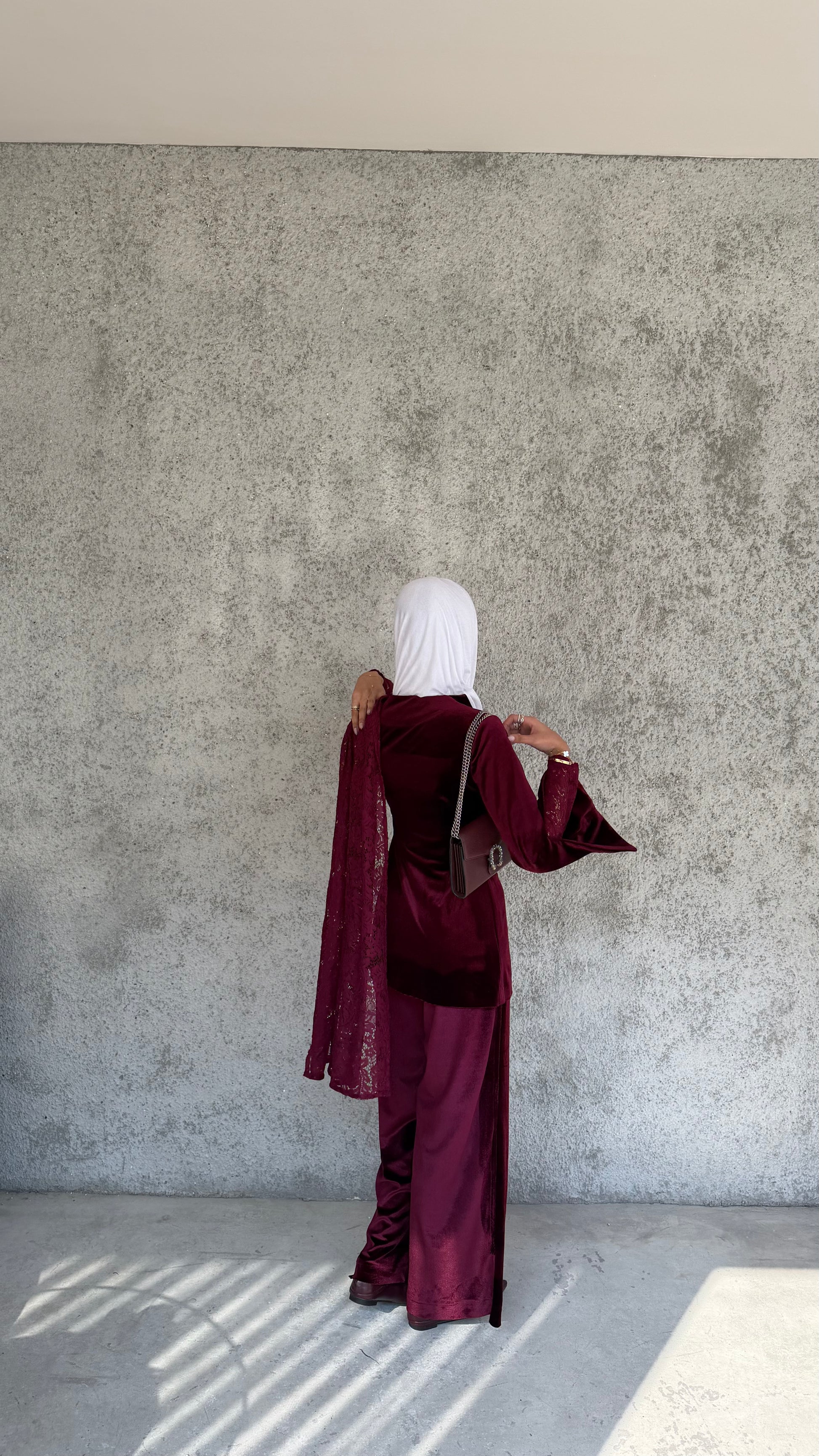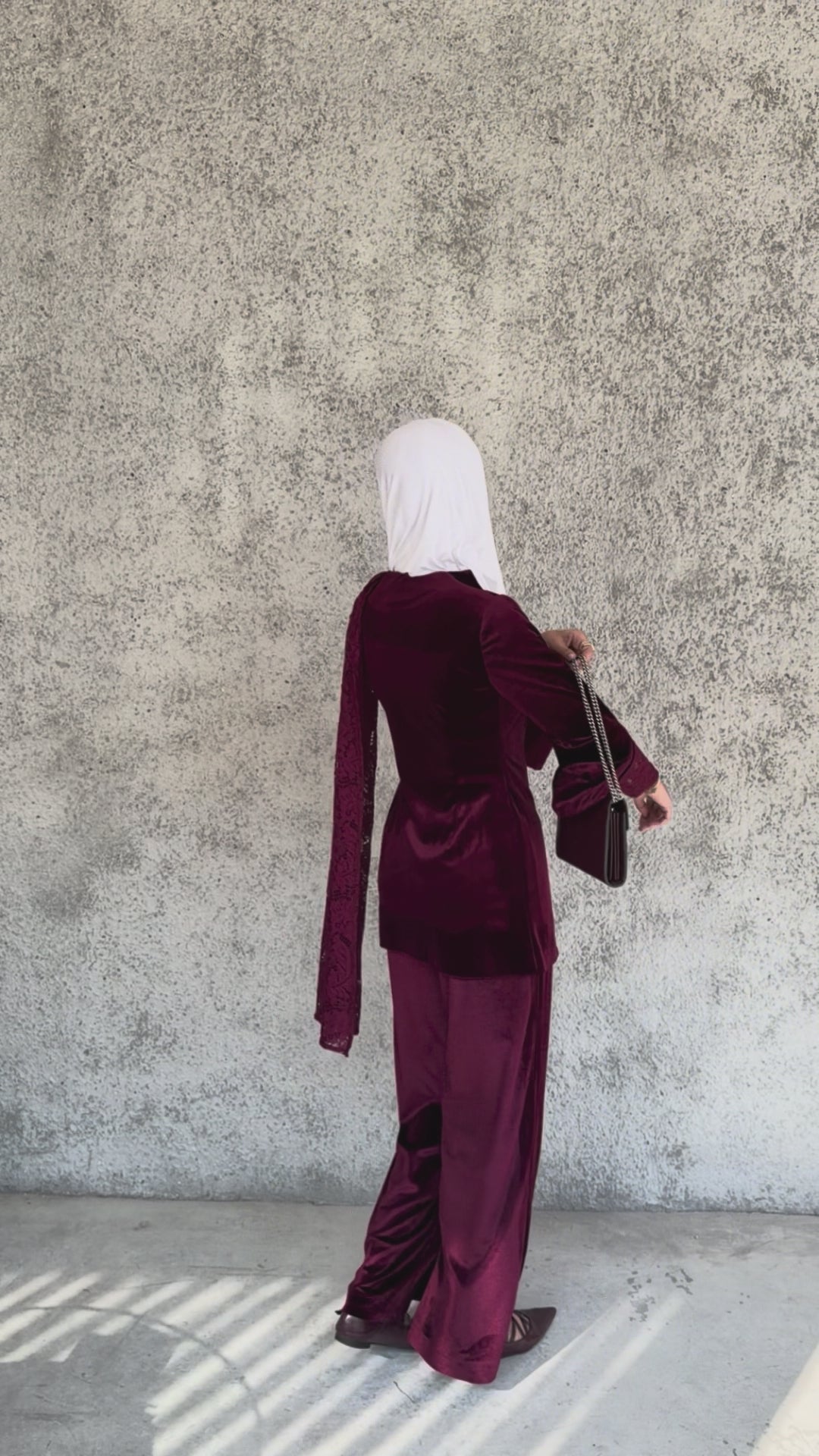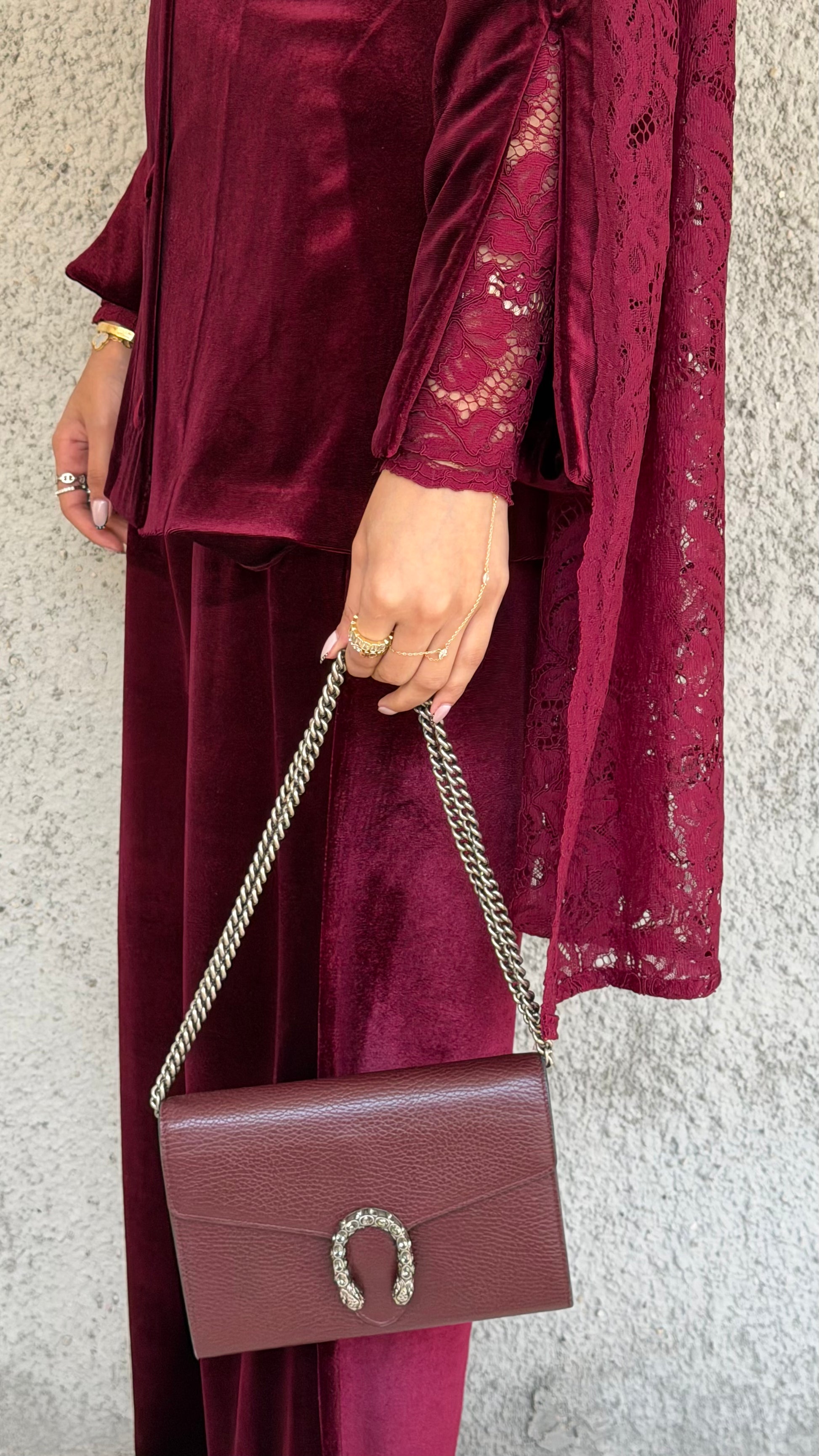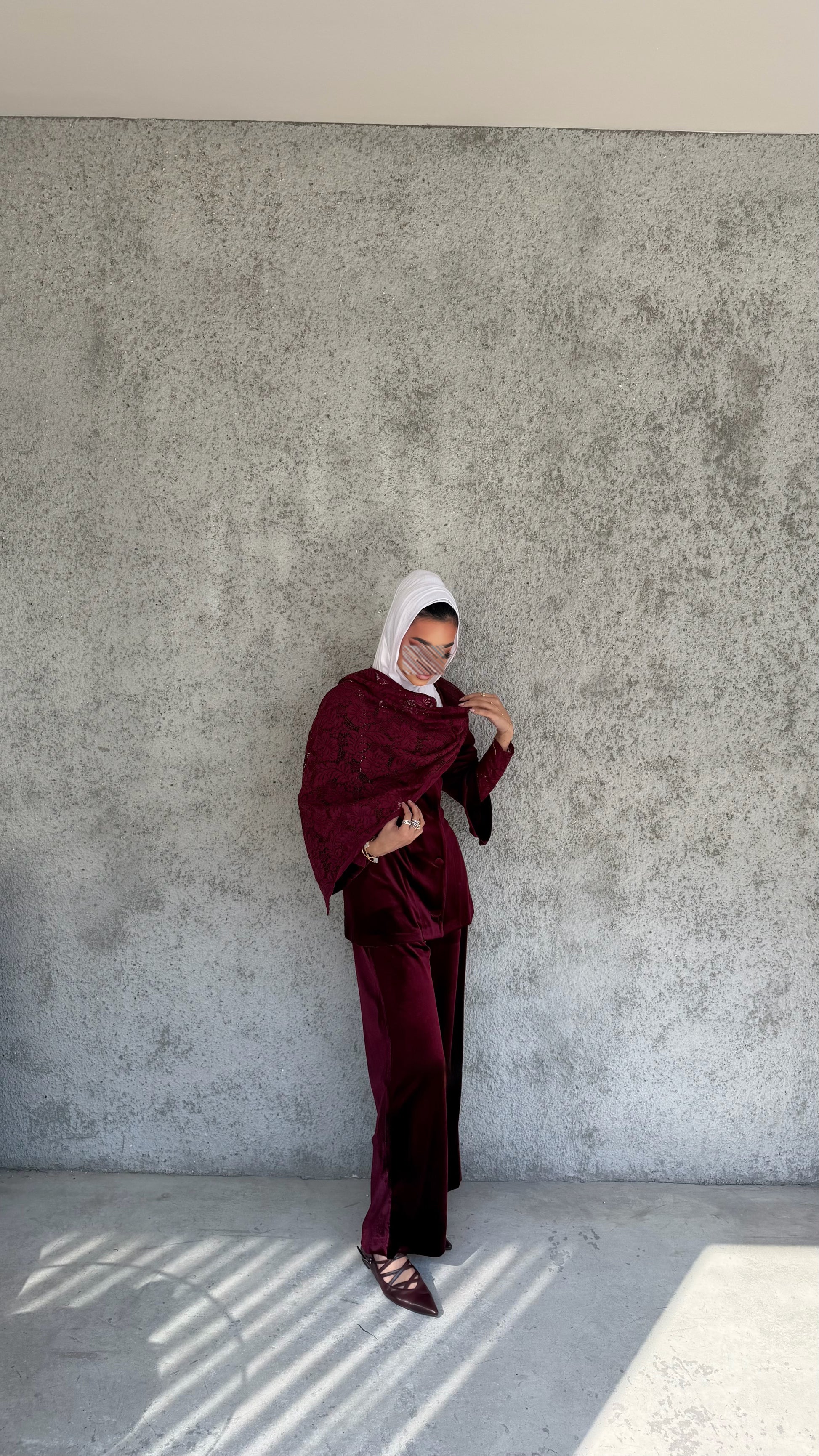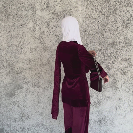 Elevate your wardrobe with this luxurious velvet and lace set, featuring a chic jacket with lace sleeves and a matching lace scarf paired with elegant velvet pants. Crafted from rich burgundy velvet and delicate lace, it offers a perfect blend of comfort, sophistication, and timeless style.
